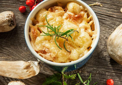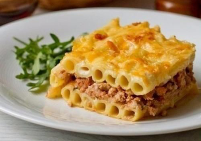 Запеченная говядина с пенне под сырно-горчичным соусом