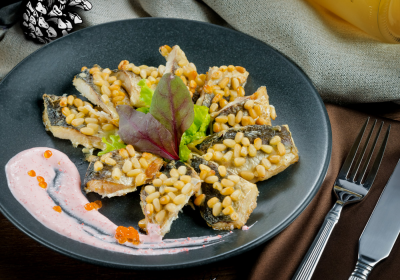Байкальский сиг в кедровых орешках и сливочно-икорном соусе