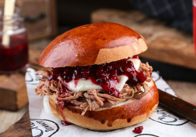 Бургер с рваной олениной, сыром моцарелла, глазированным луком и джемом